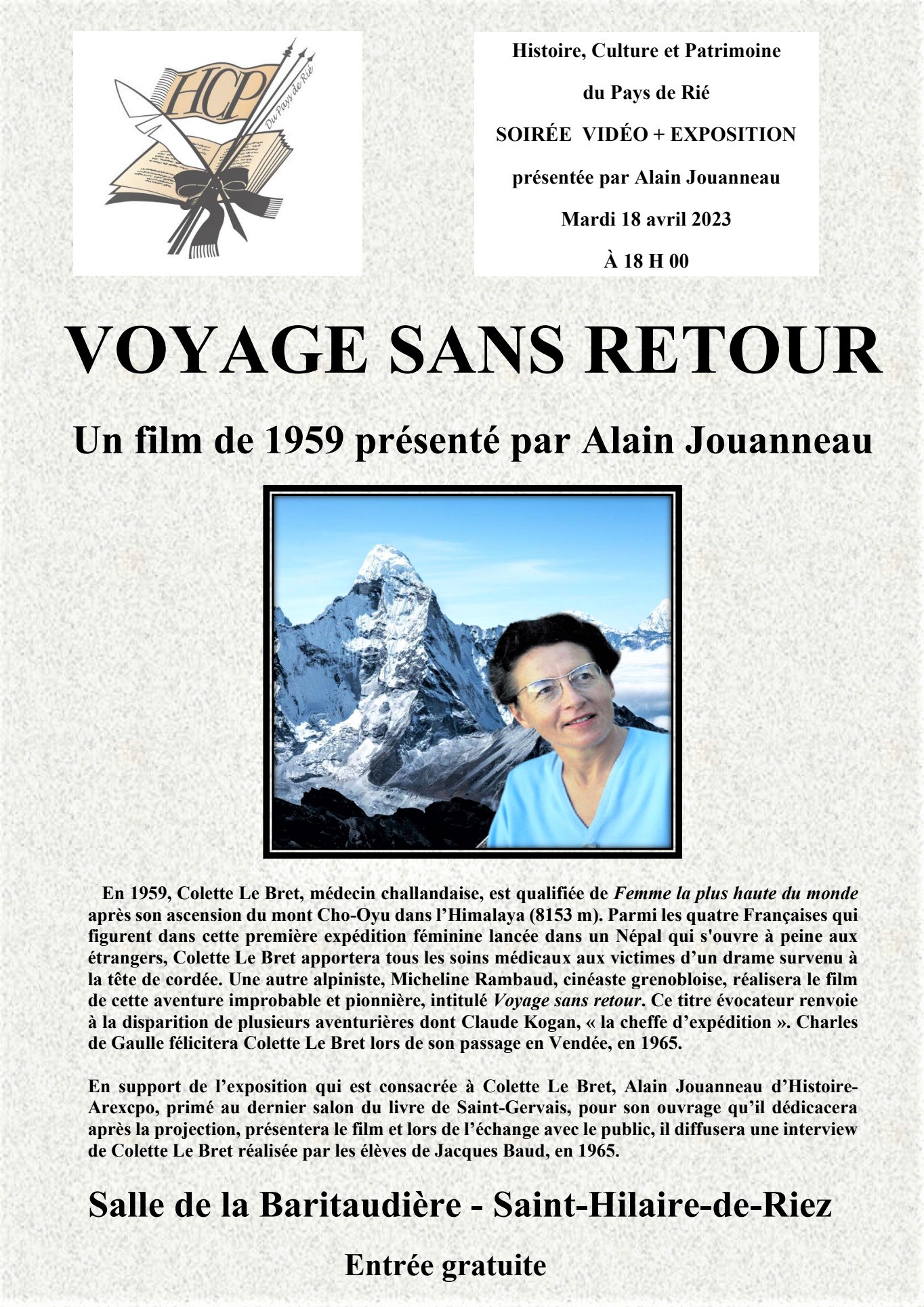 M Alain Jouanneau nous présente un film réalisé à l’occasion de l’exposition consacrée à l’alpiniste Colette Le Bret.