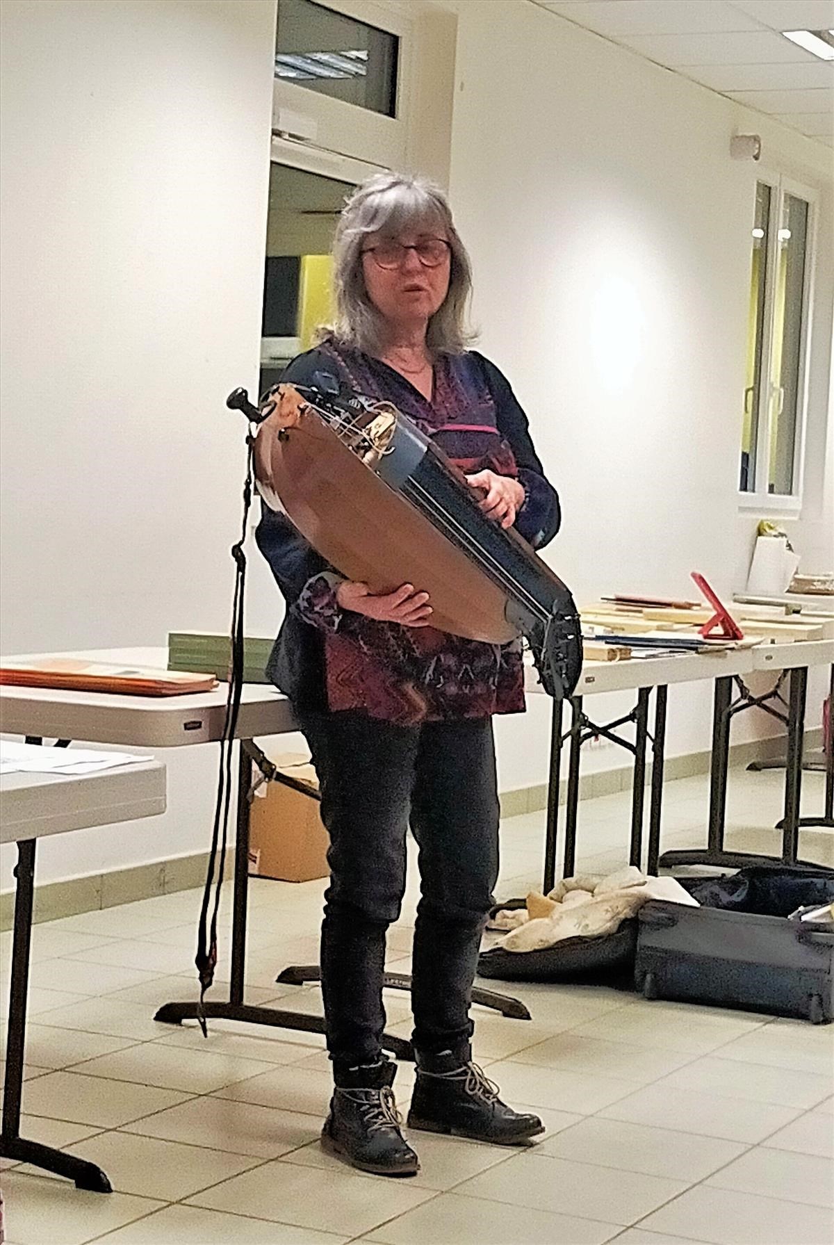 Isabelle Simon a présenté son instrument à cordes frottées, la vielle à roue. Puis elle a interprété des morceaux vendéens et berrichons